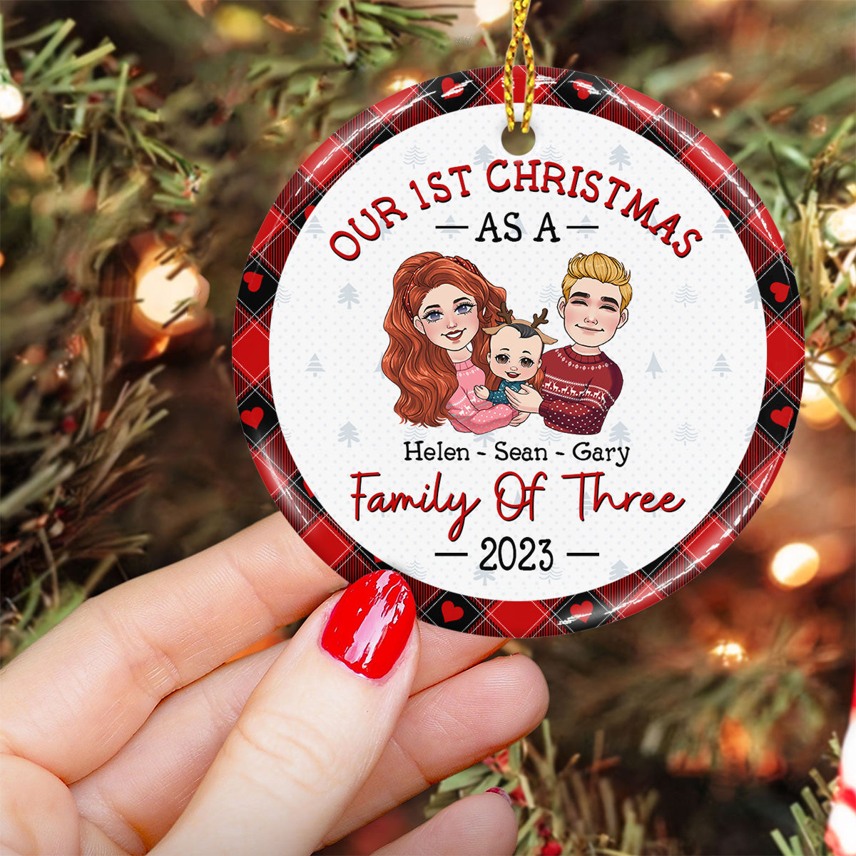 1St Christmas As Family Of Three - Gift for Newborn - Personalized Ceramic Circle Ornament