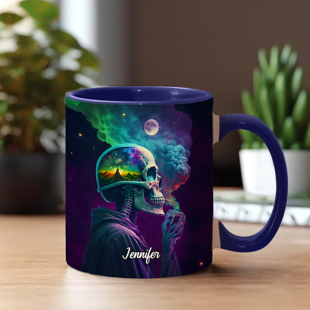 - High quality ceramic mug with two-tone rim, interior, & handle