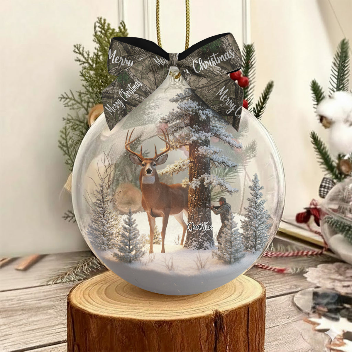 At the base of the globe, a custom acrylic piece is securely attached. Topping it all off is a fully printed decorative bow, adding the final elegant detail that makes this ornament stand out on any Christmas tree.