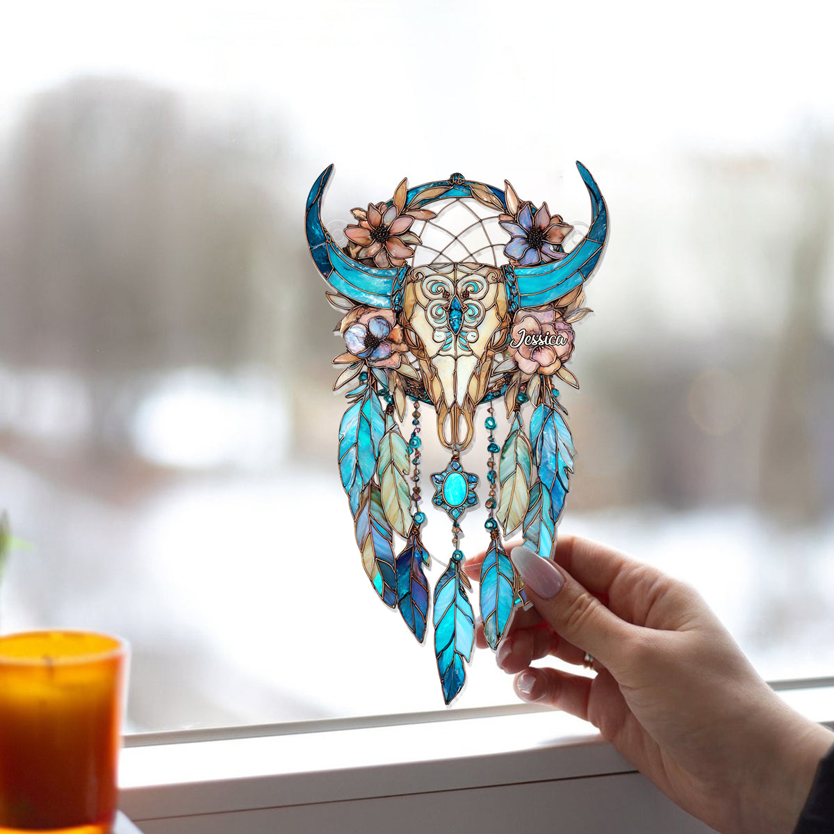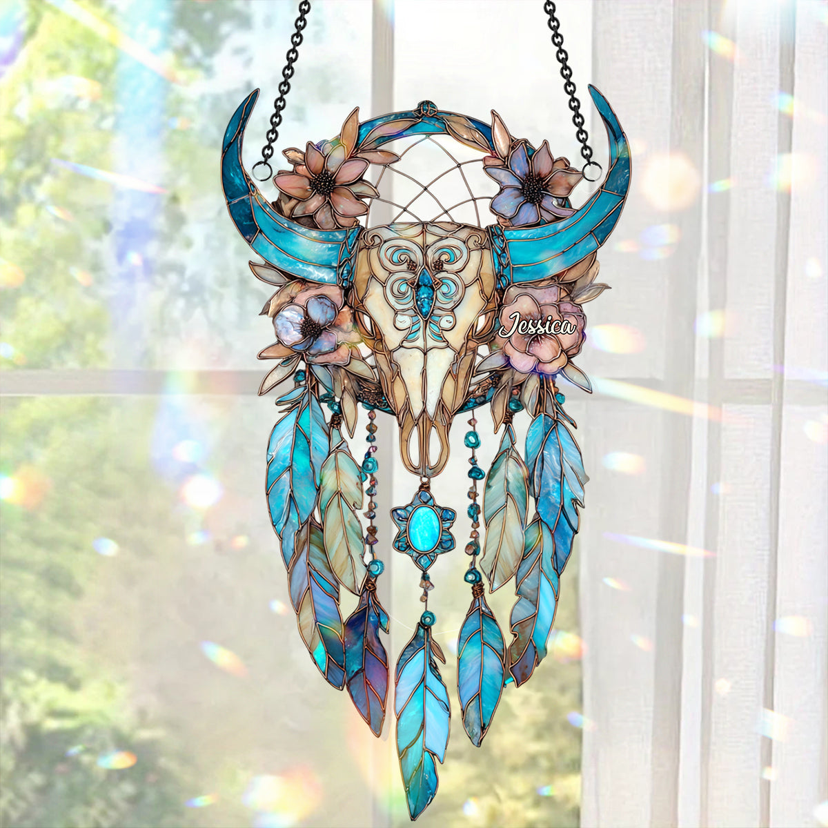 Floral Bull Skull - Personalized Cowgirl Window Hanging Suncatcher Ornament