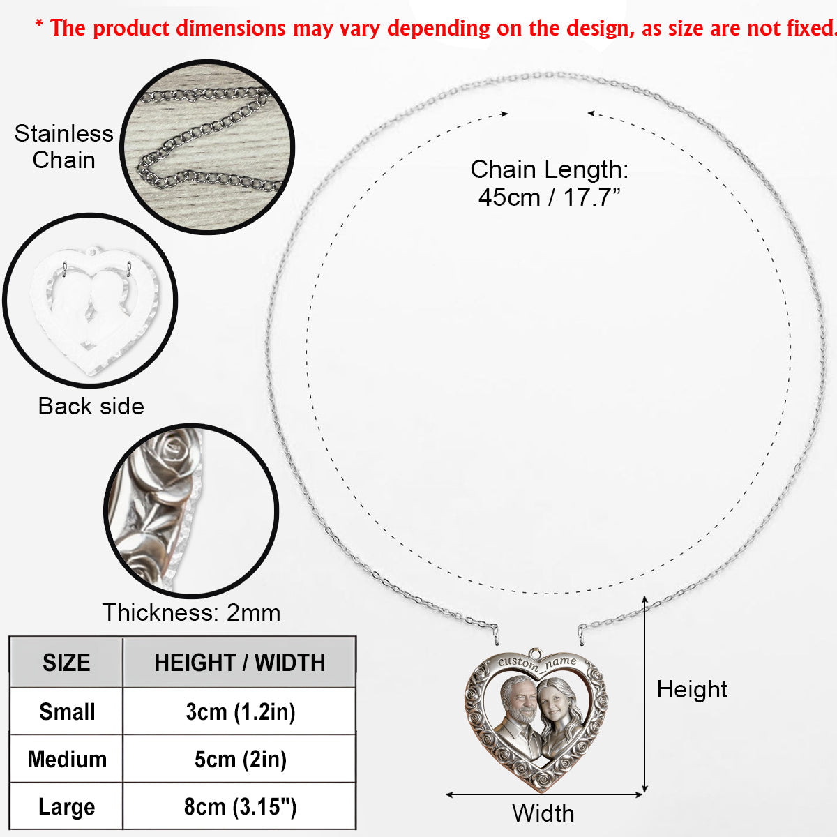 Add a personal touch to your jewelry collection with our Custom Shaped Pendant Necklace, crafted from durable stainless steel for long-lasting shine and style. This pendant is available in three sizes—3cm (1.18 inches), 4cm (1.57 inches), and 8cm (3.15 inches)—and features UV printing technology for vibrant, high-quality designs that stand the test of time.