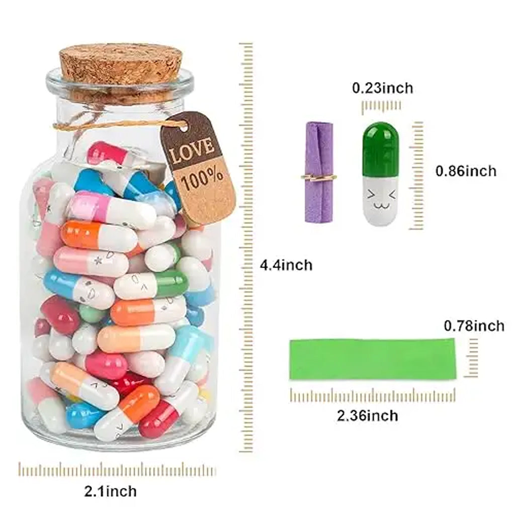 - Contents: 1 glass jar, 1 LOVE charm, 50 capsules with papers inside.