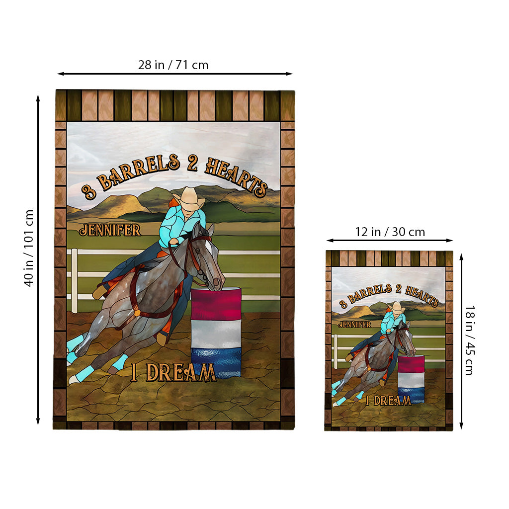 3 Barils, 2 Cœurs, 1 Rêve - Drapeau de jardin personnalisé avec motif cheval