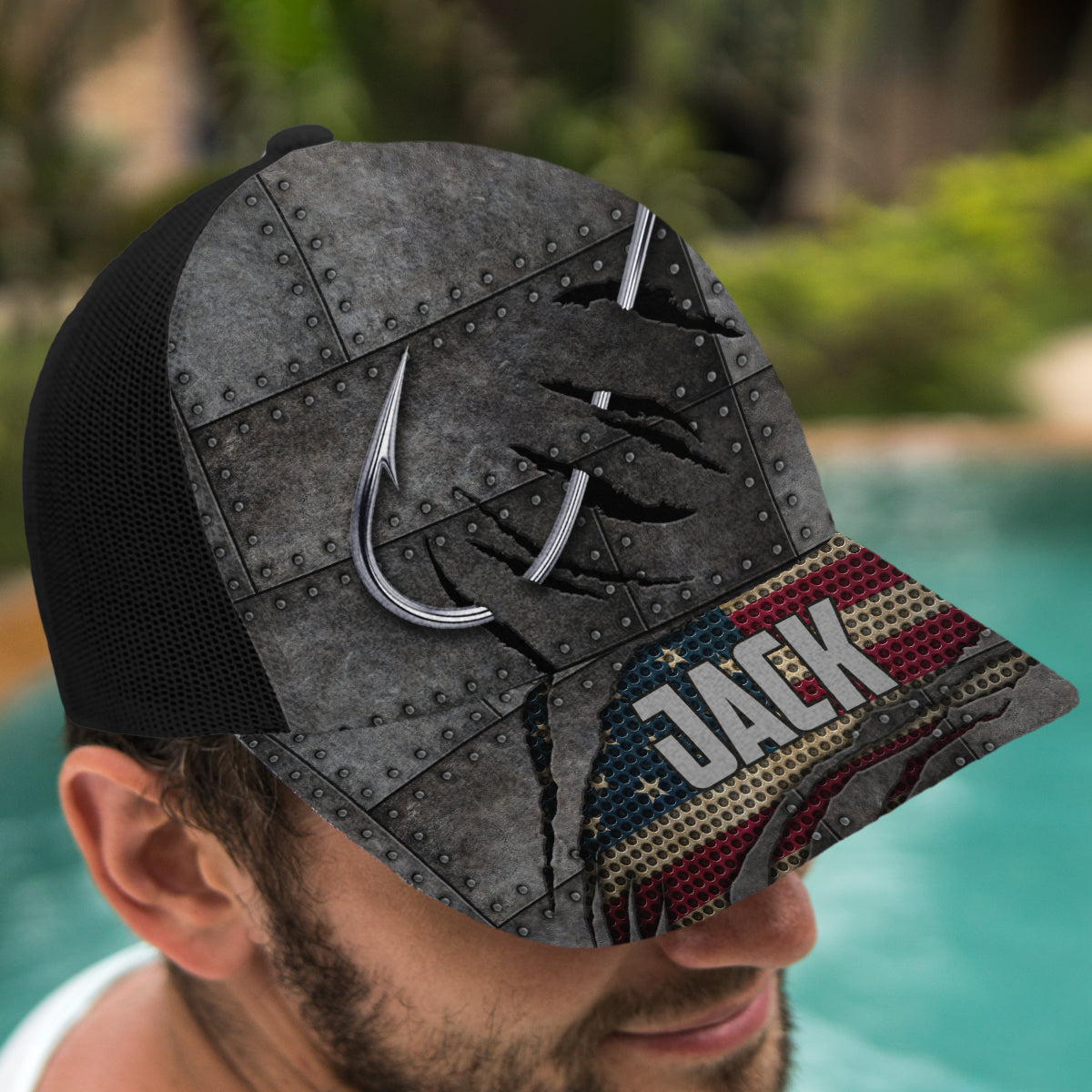 Casquette de pêcheur personnalisée Red White Blue Anglers (maille noire)