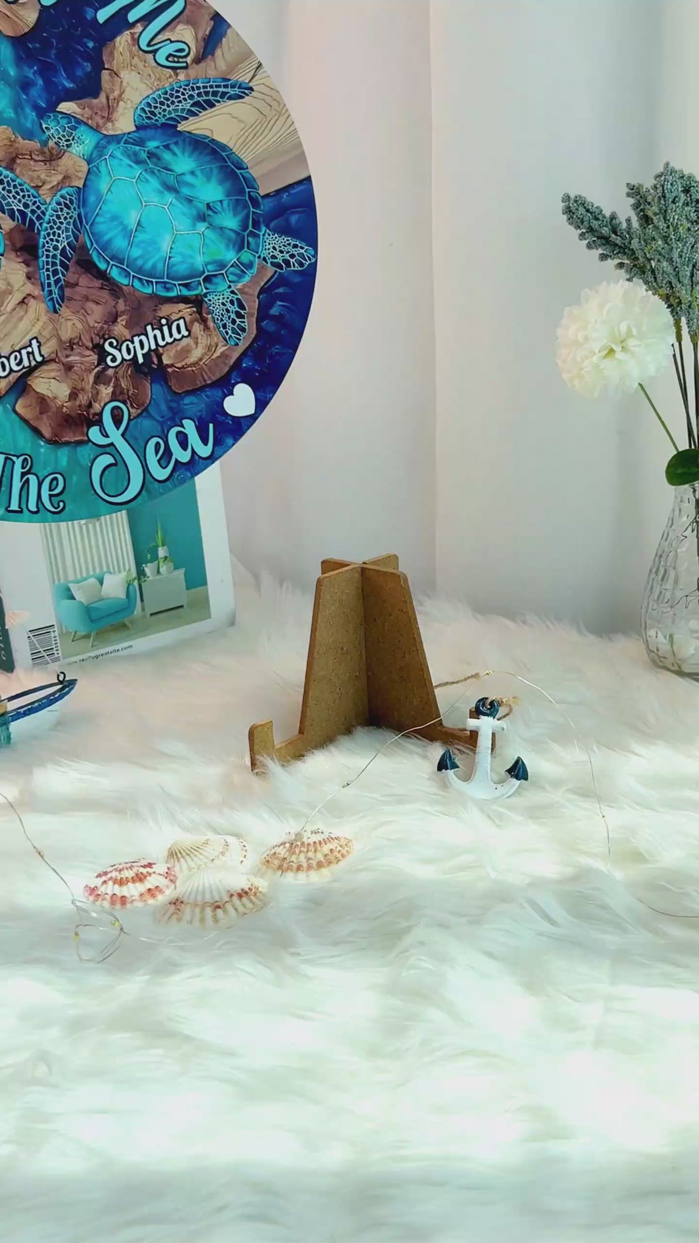 Toi, moi et la mer - Panneau rond en bois personnalisé avec une tortue