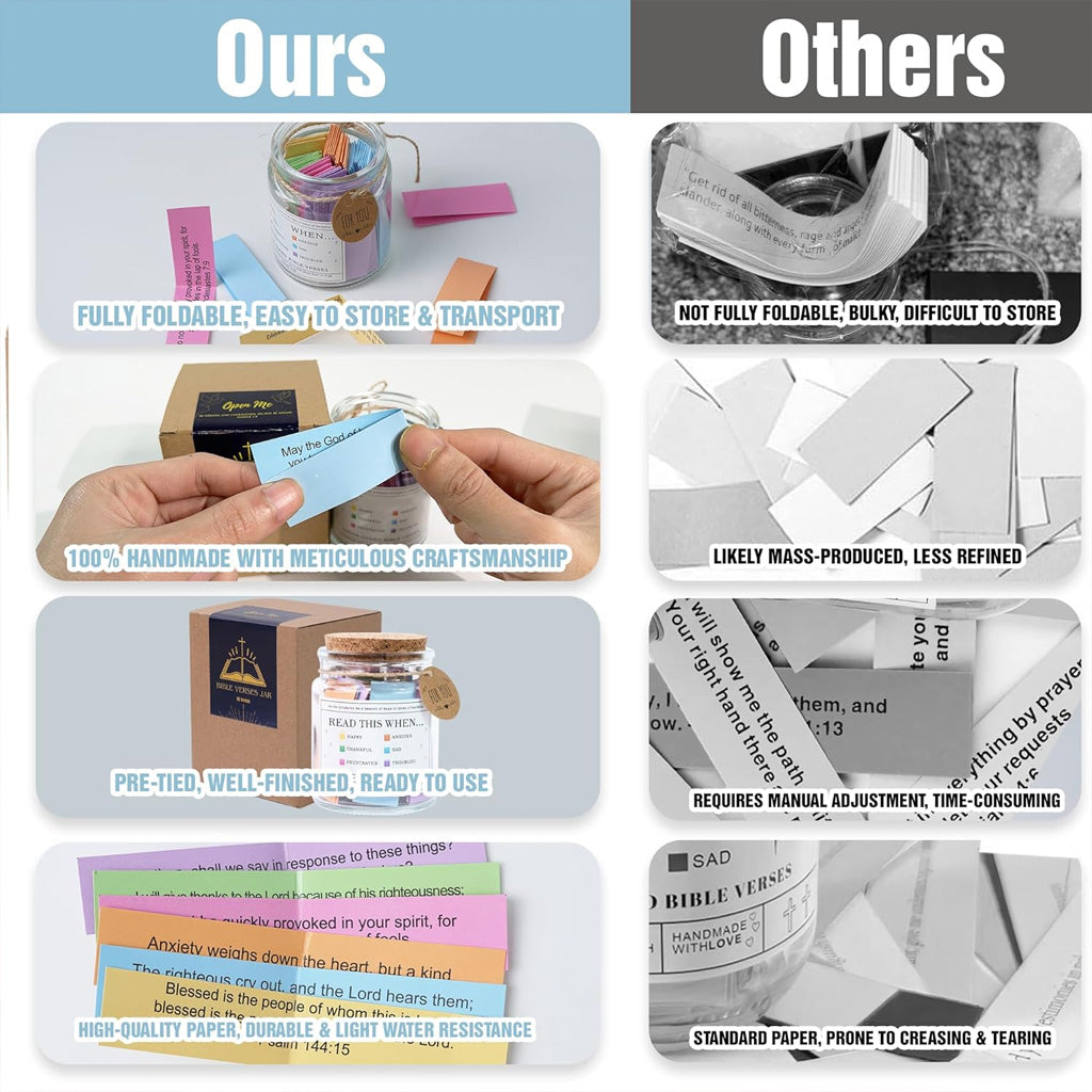 Célébrez l'amour inconditionnel de votre mère avec un cadeau qui parle du cœur. Le bocal en verre à versets bibliques contient 92 versets soigneusement sélectionnés, chacun associé à une couleur correspondant à une émotion pour apporter réconfort, encouragement, force et paix, quelle que soit la journée. Qu'elle se sente joyeuse, anxieuse ou en quête d'espoir, chaque verset lui offre un moment de recueillement et de connexion.