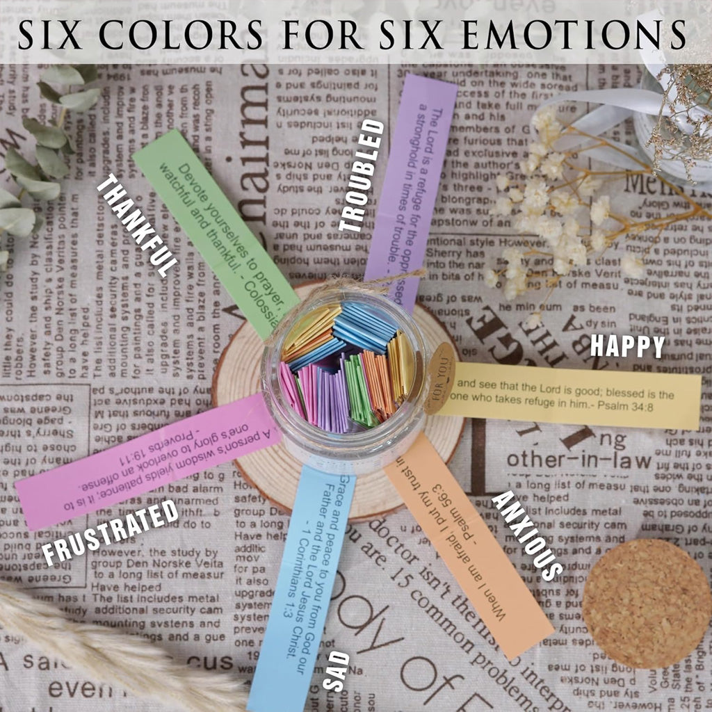 6 Couleurs pour 6 Émotions : Les versets sont classés en six thèmes émotionnels — la joie, la gratitude, l'anxiété, l'espoir, la paix et l'amour — aidant ainsi le lecteur à trouver le message approprié au moment présent.