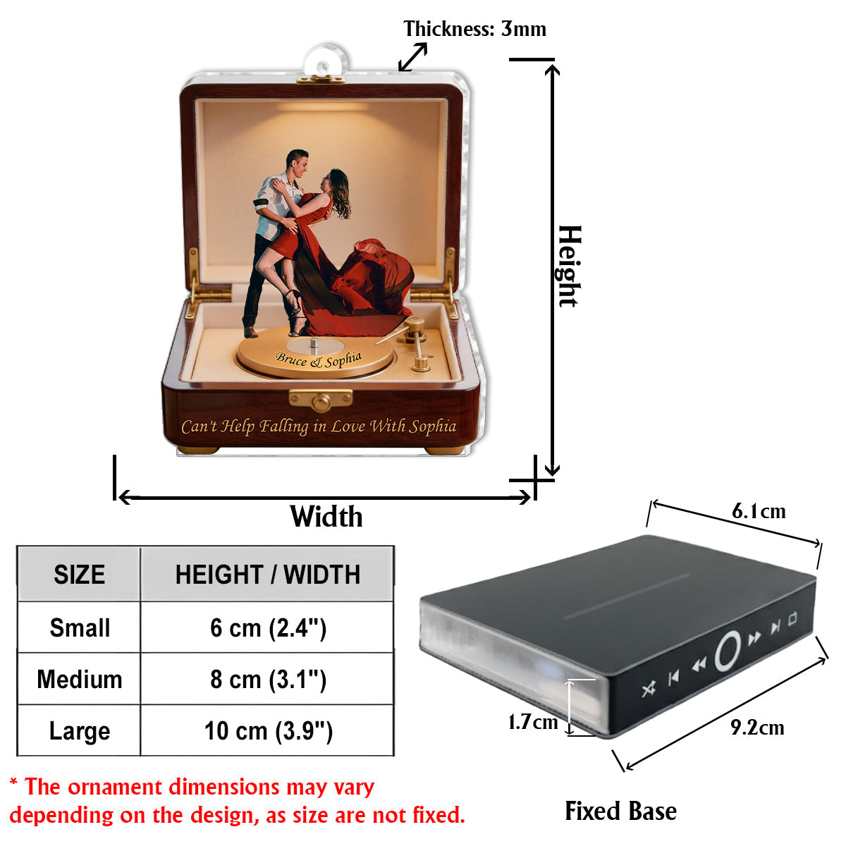 - Matériau : Acrylique, dimensions 10 cm x 10 cm x 2 cm (3,9" x 3,9" x 0,8").