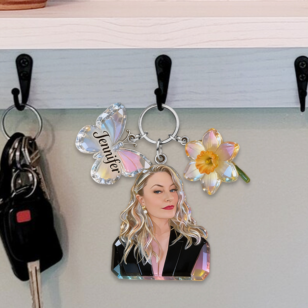 Porte-clés personnalisé avec photo et fleur pour votre anniversaire - Porte-clés amour-propre orné de breloques
