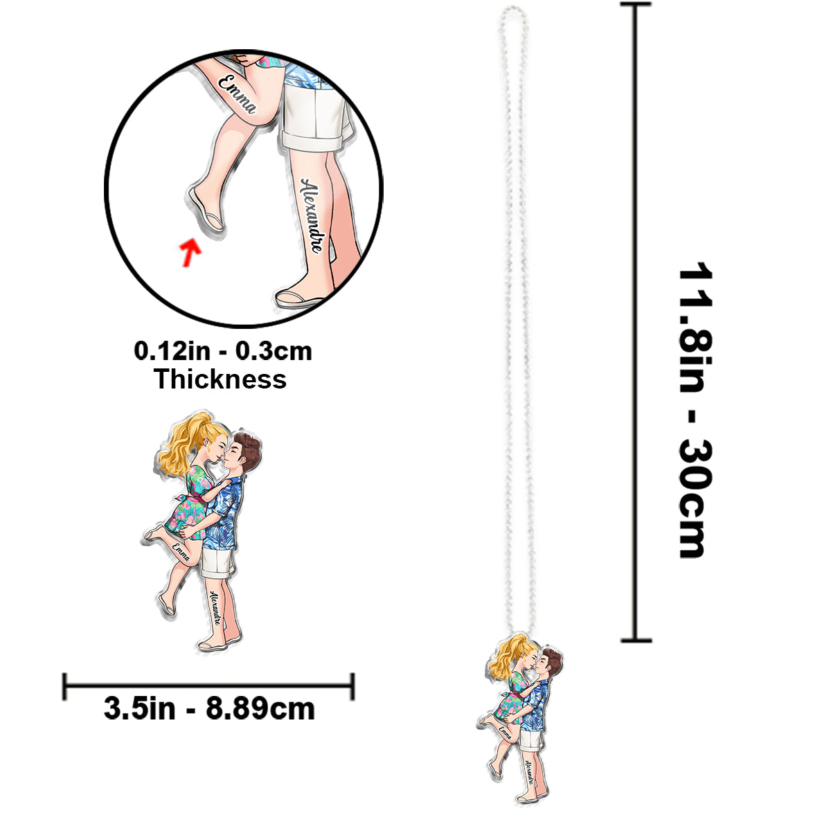 Ces porte-clés de voiture personnalisés en acrylique sont le cadeau idéal pour un être cher ou un ami, ou tout simplement pour se faire plaisir. Conçus pour vous accompagner lors de tous vos trajets et garder vos proches et vos souvenirs précieux près de votre cœur, ces porte-clés uniques apportent une touche personnelle et une énergie positive à l'intérieur de votre voiture. Ils sont fournis avec une chaînette à billes en acier inoxydable pour les accrocher à votre rétroviseur et constituent un cadeau parfait pour un anniversaire, la Saint-Valentin, Noël, la fête des Pères, la fête des Mères, un anniversaire de mariage ou une remise de diplôme, ou pour toute autre occasion.