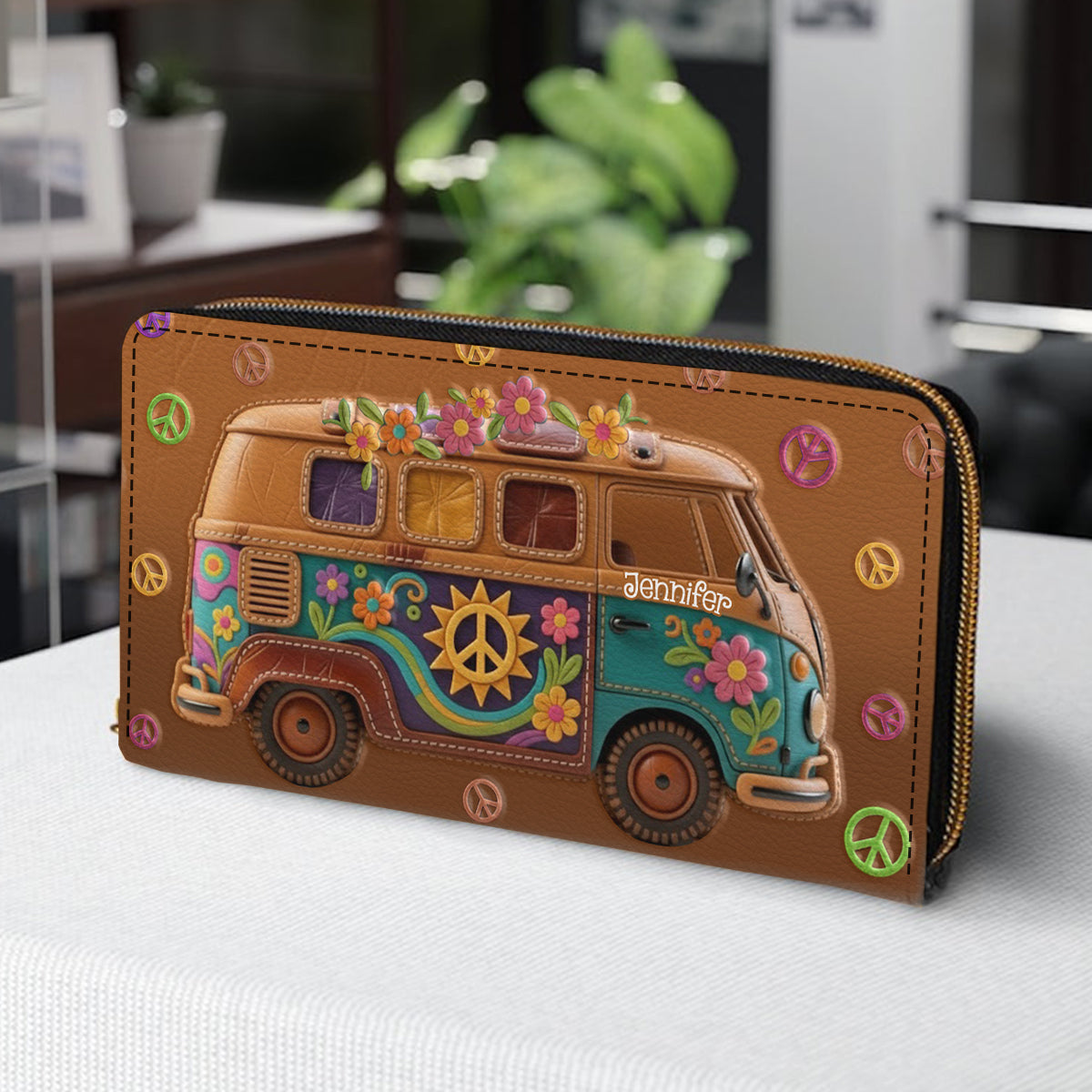 Van hippie fleuri - Portefeuille long en cuir hippie personnalisé