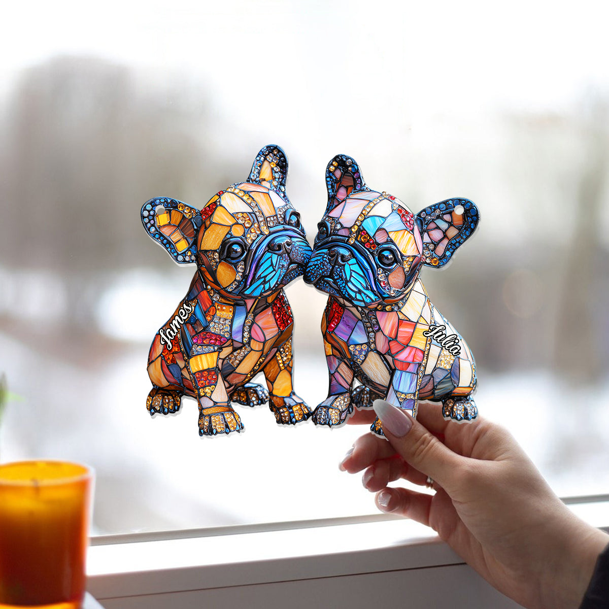 Couple de bouledogues français - Décoration attrape-soleil personnalisée à suspendre à la fenêtre, représentant un bouledogue français