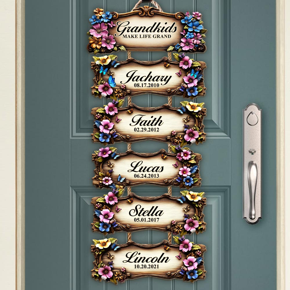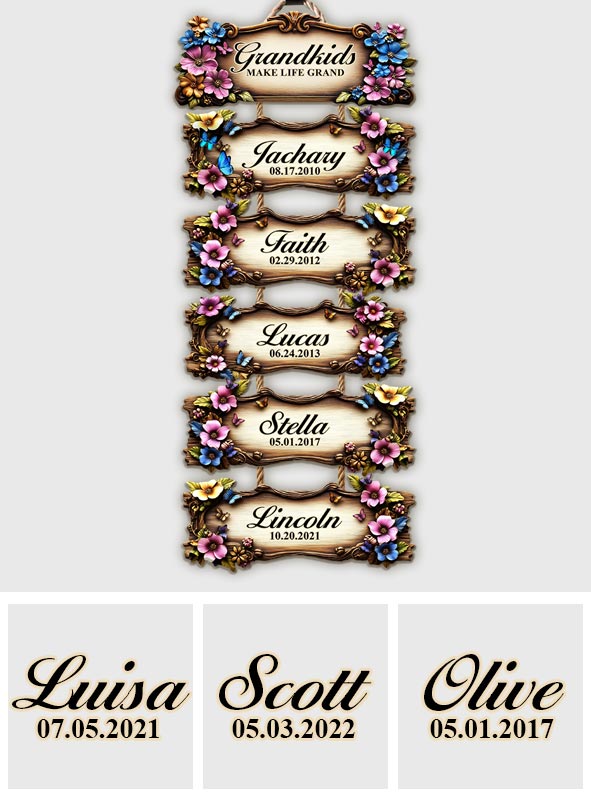 Ce cadeau personnalisé unique illuminera le regard de votre maman ou de votre grand-mère avec les noms et dates de naissance de leurs petits-enfants. Il peut être complété au fil des années, ce qui en fait le cadeau idéal pour la Fête des Mères ! Un présent chargé d'émotion qui sera chéri année après année, parfait pour les grands-parents souhaitant immortaliser l'histoire de leur famille en y inscrivant les noms de leurs petits-enfants et arrière-petits-enfants. Il convient également parfaitement aux parents. Chaque plaque en bois est réalisée sur commande, à partir de bois de première qualité, soigneusement découpée et poncée à la main.