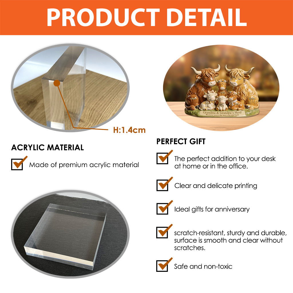 Famille de vaches Highland du troupeau de grand-mère et grand-père - Plaque acrylique personnalisée en forme de grand-mère