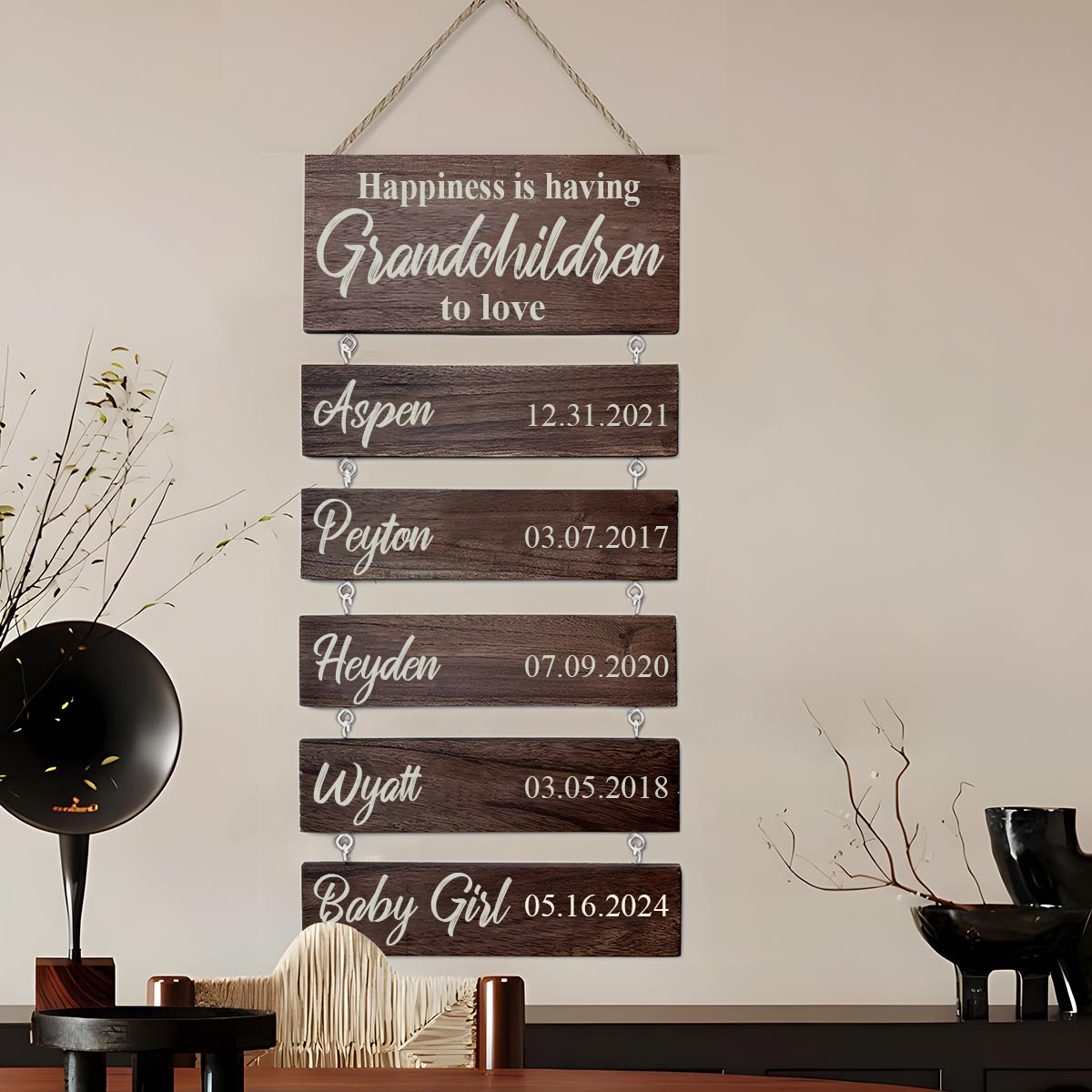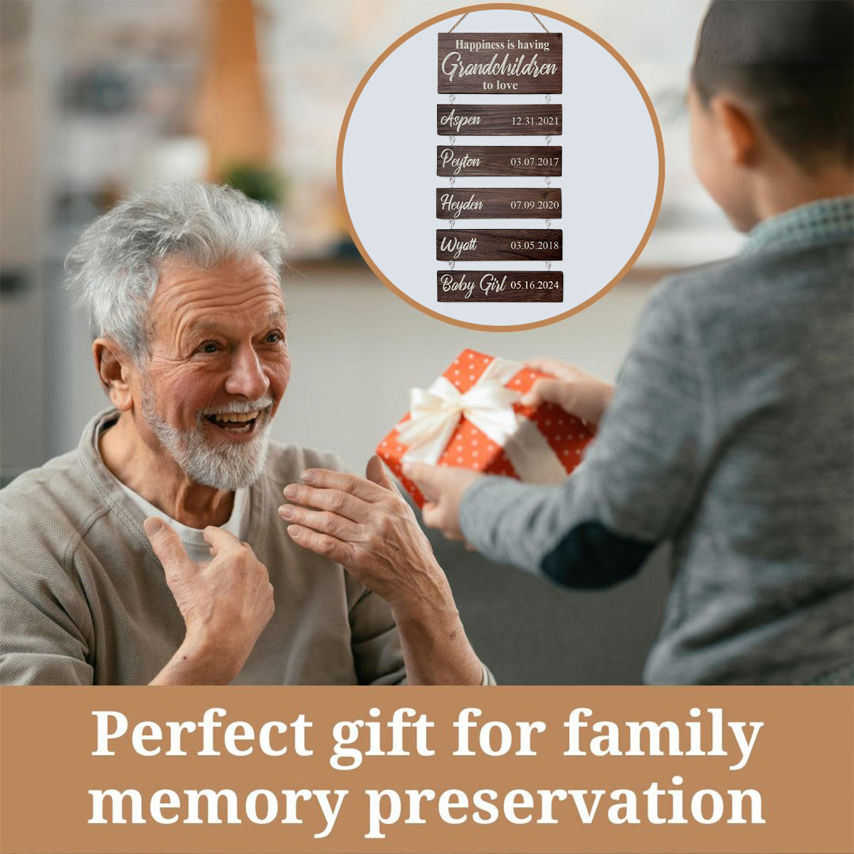 Ce cadeau personnalisé unique illuminera le regard de votre maman ou de votre grand-mère avec les noms et dates de naissance de leurs petits-enfants. Il peut être complété au fil des années, ce qui en fait le cadeau idéal pour la Fête des Mères ! Un présent chargé d'émotion qui sera chéri année après année, parfait pour les grands-parents souhaitant immortaliser l'histoire de leur famille en y inscrivant les noms de leurs petits-enfants et arrière-petits-enfants. Il convient également parfaitement aux parents. Chaque plaque en bois est réalisée sur commande, à partir de bois de première qualité, soigneusement découpée et poncée à la main.