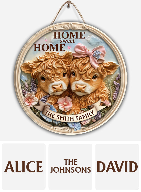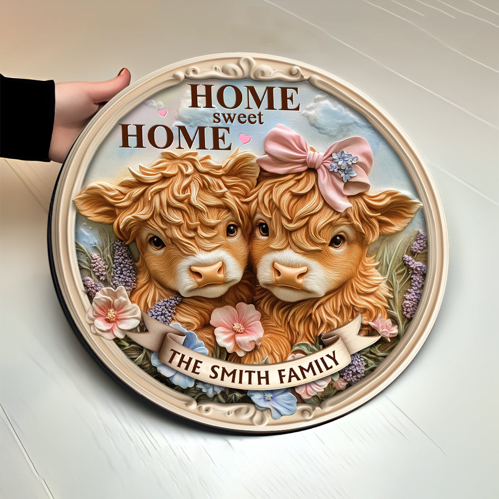 « Home Sweet Home », adorable bébé vache des Highlands - Panneau rond en bois personnalisé pour la famille