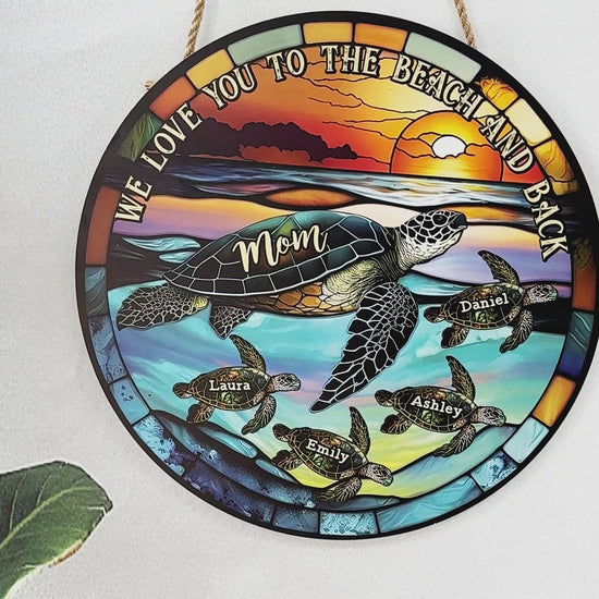 Je t'aime jusqu'à la plage et retour - Mère tortue et ses petits - Panneau rond en bois personnalisé avec tortue